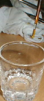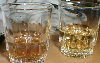 Links ist das oben genannte Glas zu sehen, rechts ein zweites, mit Leitungswasser gefülltes Glas. Beide wurden mit Lugol'scher Lösung versetzt. Die unterschiedlichen Färbungen (beim Leitungswasser gelb, bei der gelösten Folie rot) weisen einen unterschiedlichen Inhalt nach und zeigen einen negativen Stärkenachweis im Leitungswasser.