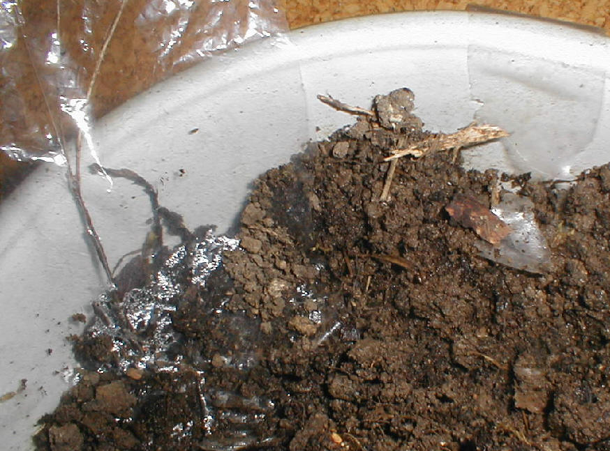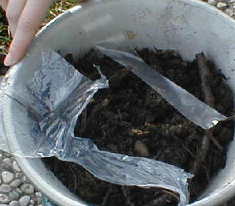 Für den Versuch wurden eine Stärkefolie (rechts) und eine Kunststofffolie (links) in ein mit Erde gefülltes Gefäß gegeben. Das Gefäß wurde mit Erde aufgefüllt und diese wurde regelmäßig mit etwas Wasser gegossen.