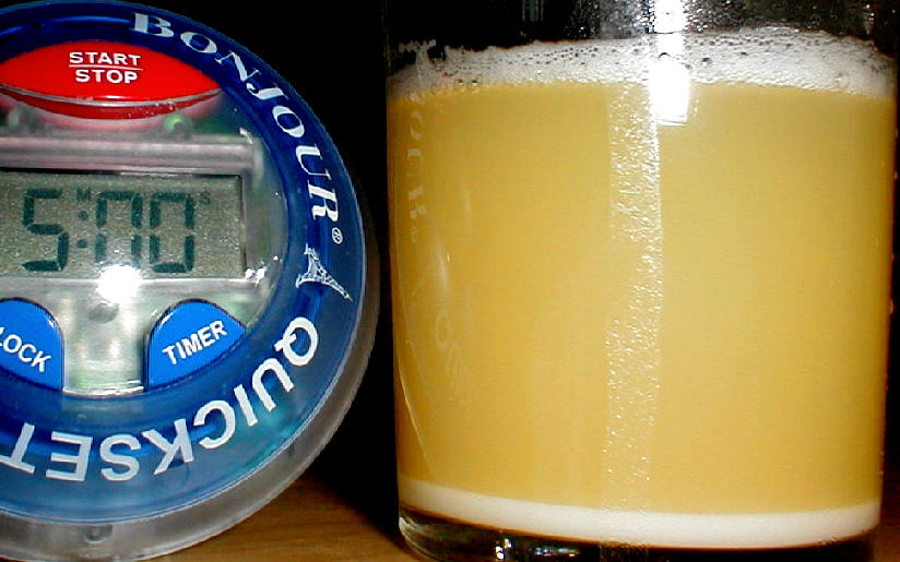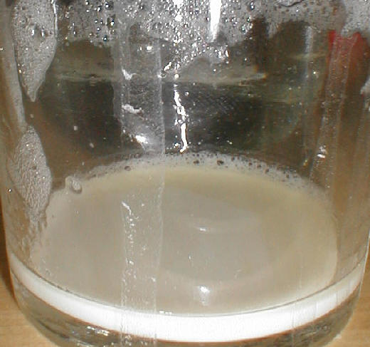 Nach ungefähr fünf Minuten hat sich die Stärke am Boden abgesetzt. ® 5.Schritt: Die Flüssigkeit wird abdekantiert Þ