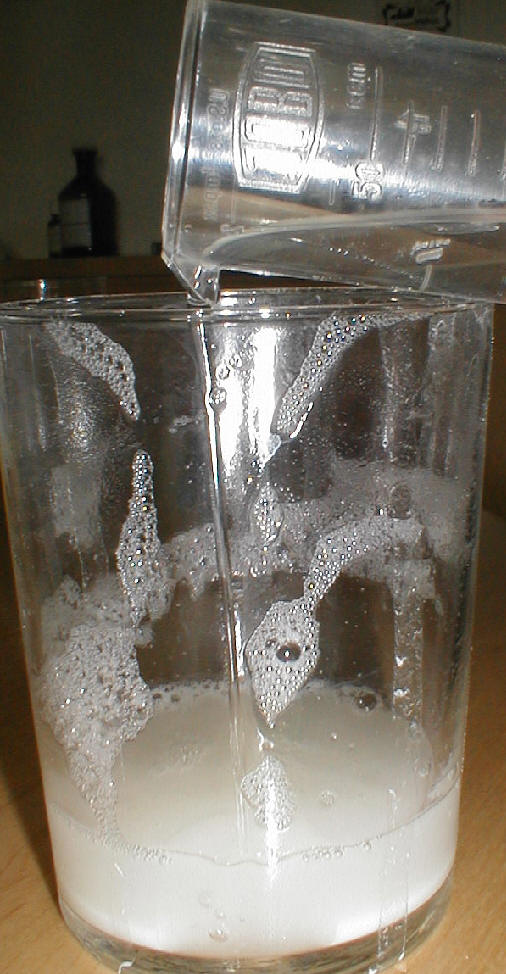6.Schritt: Es wird erneut Wasser dazugegeben und umgerührt und nach Absetzten der Stärke abdekantiert.