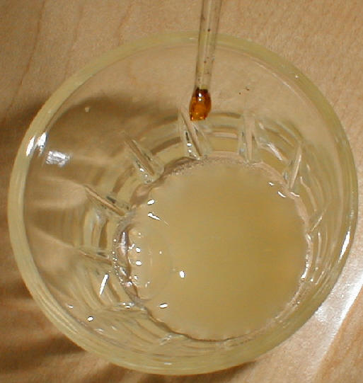 In diesem Glas ist das Wasser, aus welchem sich die Stärke absetzte, und welches anschließend abdekantiert wurde. Darauf wird nun Iodkaliumiodid-Lösung gegeben, um die darin enthaltene Stärke nachzuweisen.