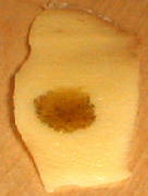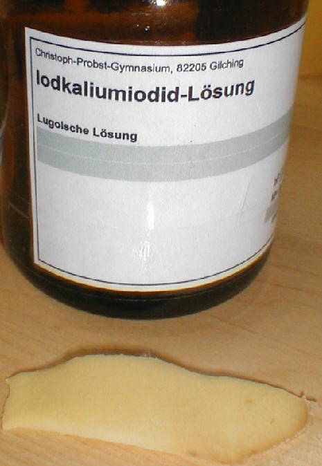 Mit einer Kartoffelschale wird die Lugolprobe durchgeführt: Dazu wird ein Tropfen Iodkaliumiodid-Lösung auf die Schale gegeben Þ