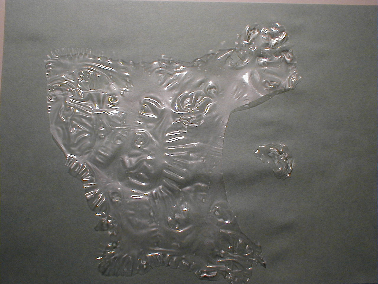 Raumtemperatur: Das nach dem Kochen, aufgrund der Dickflüssigkeit, dazugegeben Wasser verursachte eine Klumpenbildung. Einige Klumpen sind noch immer in der Folie sichtbar. Auch diese Folie trocknete ca. drei Tage. Sie nicht ganz so stabil wie Nr. 1, und weist Falten auf. Dafür war sie leichter abzulösen und nicht so klebrig.