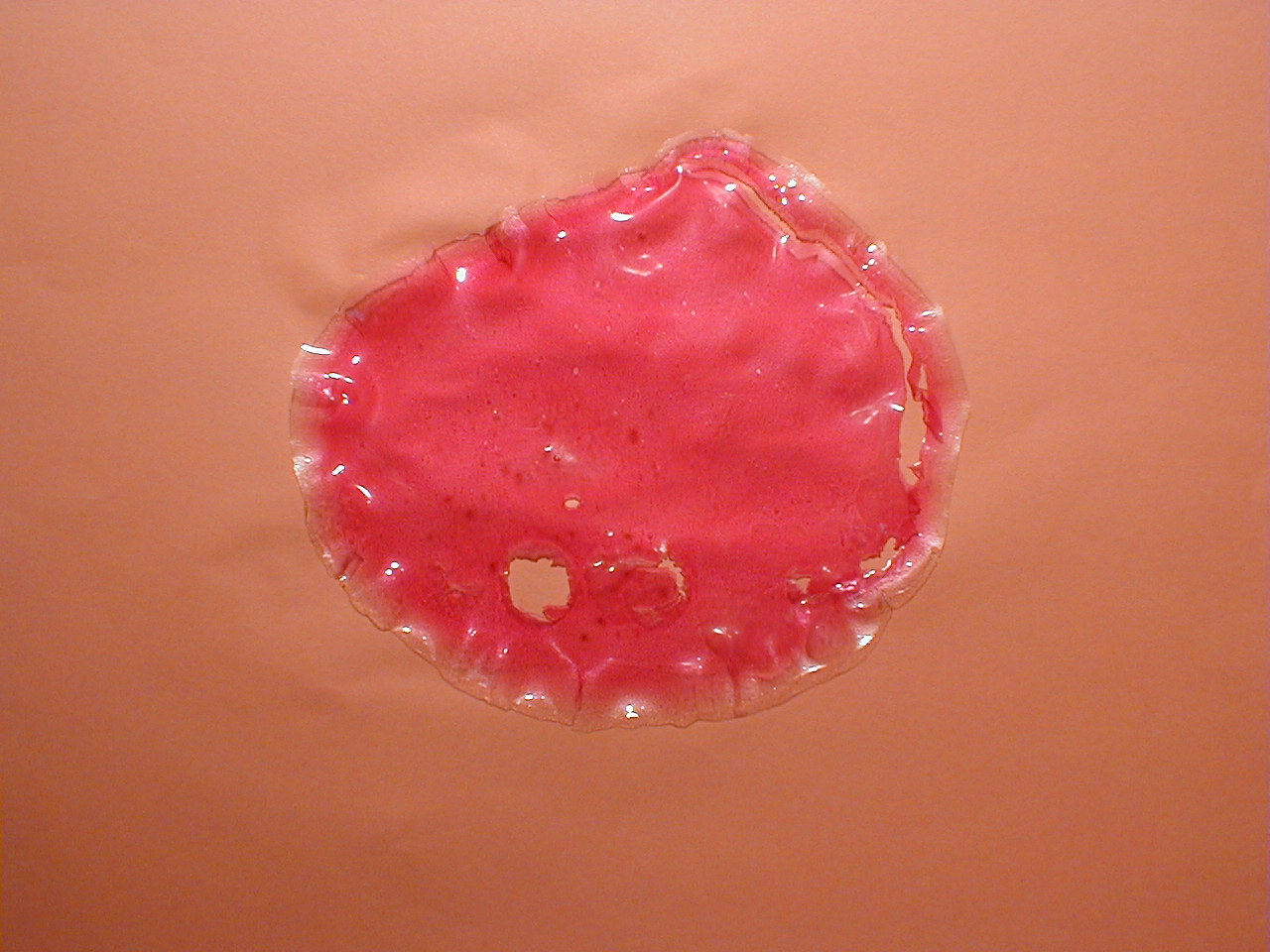 Plexiglasscheibe, getrocknet bei Raumtemperatur: Diese Folie war trotz der zu Beginn zugegebenen, erhöhten Menge an Wasser nach dem Kochen zähflüssig. Auch sie brauchte einige Tage um zu trocknen, und war anfangs schwer abzulösen. Sie ist relativ stabil und fest, und farbig.