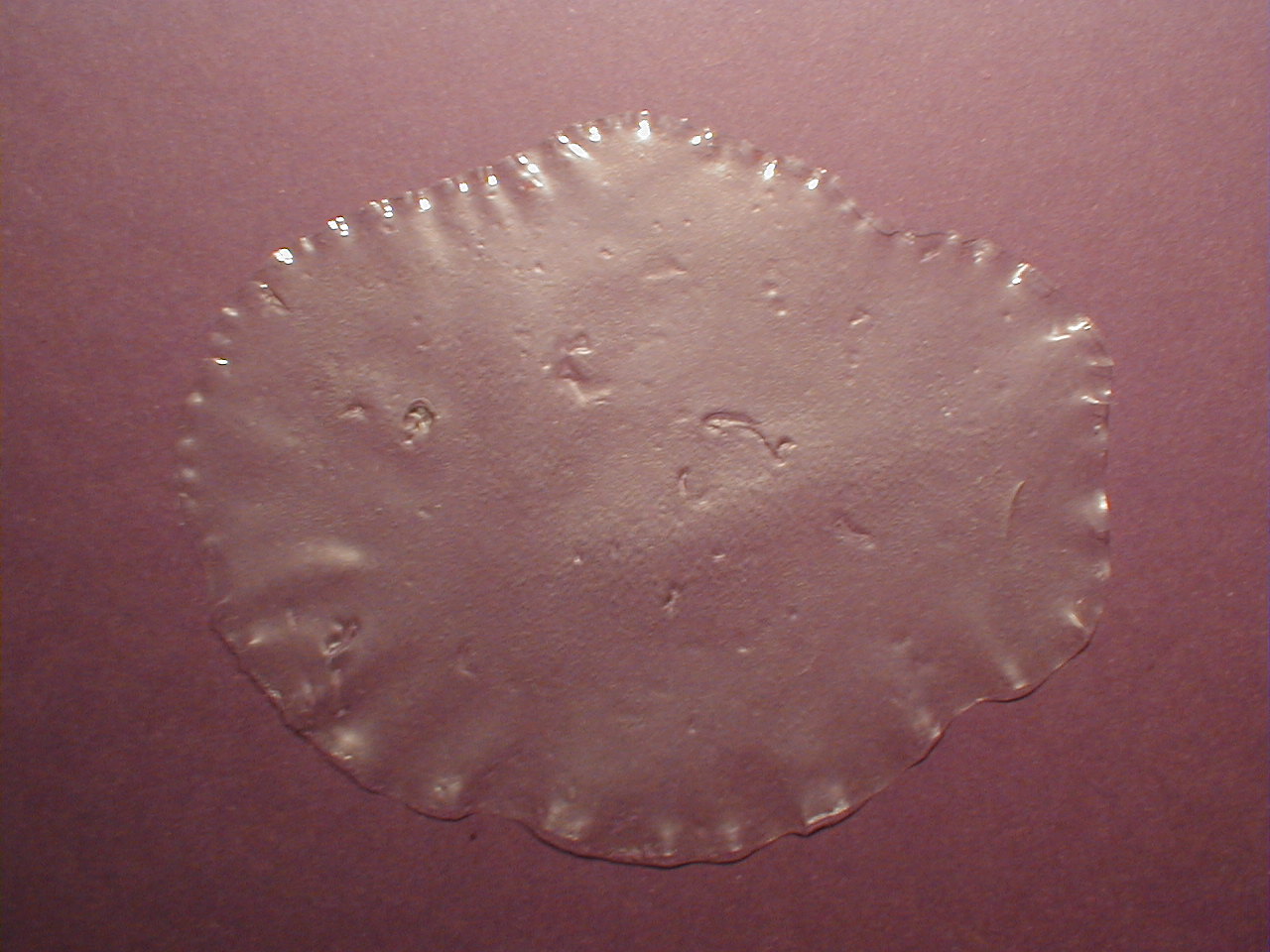 Plexiglasscheibe, getrocknet bei Raumtemperatur: Die Masse dieser Folie lies sich gut aus dem Glas gießen. Die Folie war schnell getrocknet (weniger als 24 Stunden) und war leicht von der Platte zu lösen. Sie ist etwas elastisch und recht stabil.